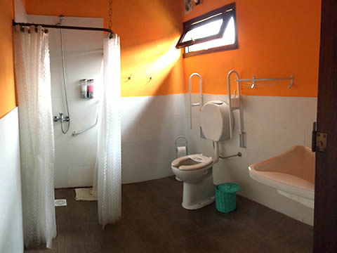 Cuádruple con cama matrimonial y 2 camas twin o triple/doble adaptada para personas con movilidad reducida. Baño privado con ducha adaptado. Tv pantalla plana de 32, frigobar, wi fi, calefacción, ventilador y aire acondicionado. Piso de cemento alisado.